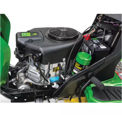 - John Deere easy change 30-second oil change system is under the hood, this all-in-1 oil and oil filter canister, allows anyone to easily change their oil with no tools required