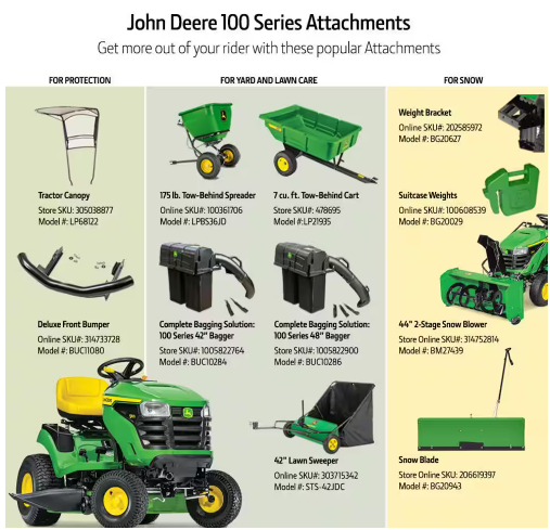 - Baggers, carts, aerators, spreaders, front blade, mulch plug and snow blowers are sold separately to help with projects around the yard