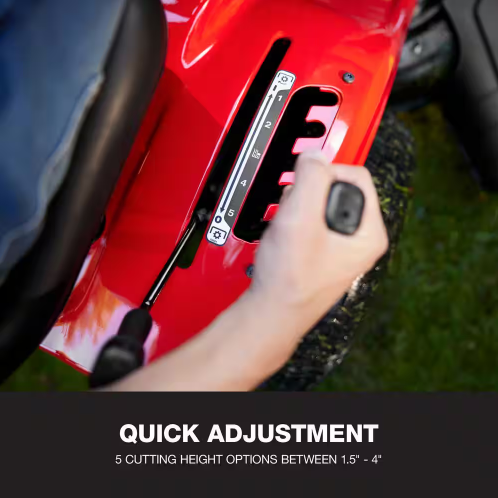 - Twin-blade, side discharge deck cuts quickly and cleanly with 5-position deck height adjustment
